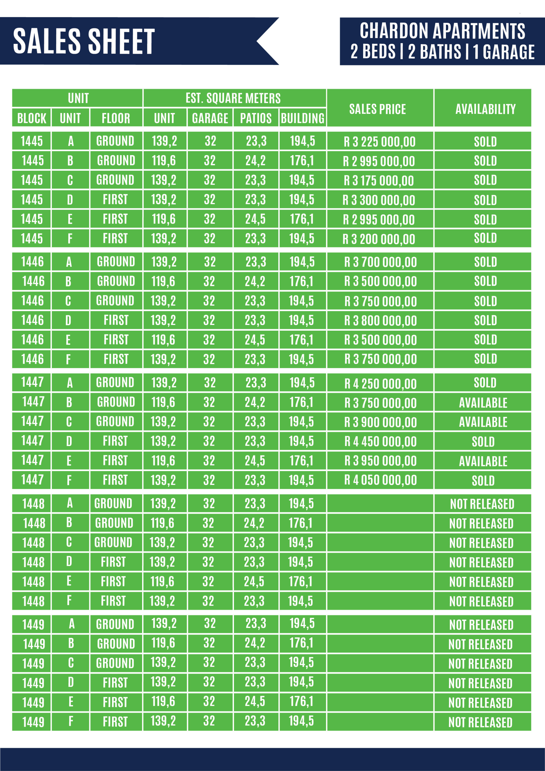Let’s break down the Chardon Village Apartments layout. It comprise of 5 blocks each with 6 two-bedroom apartments, 3 being on the ground and 3 being on the first floor. These spacious and modern two-bedroom apartment opportunities will be available at a purchase price starting from R3,500 000 including VAT and transfer duties.