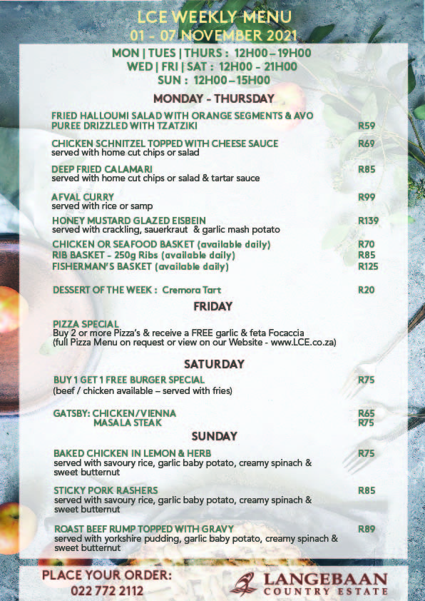 LCE Weekly Menu – We are open for Sit Down in our Horizon Restaurant every Wednesday & Friday from 17h30 – 21h00 & Sunday Lunch from 12h00 – 15h00.