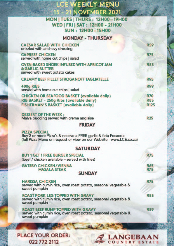 LCE Weekly Menu – We are open for Sit Down in our Horizon Restaurant every Wednesday & Friday from 17h30 – 21h00 & Sunday Lunch from 12h00 – 15h00.
