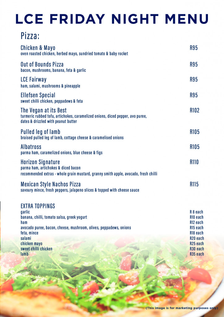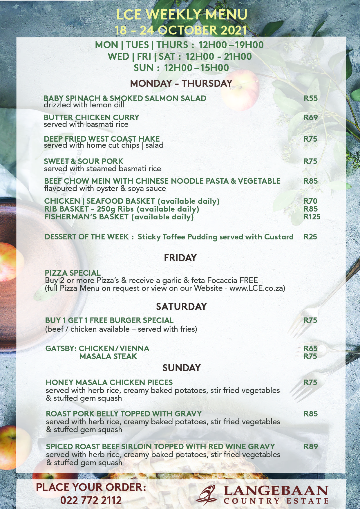LCE Weekly Menu – We are open for Sit Down in our Horizon Restaurant every Wednesday & Friday from 17h30 – 21h00 & Sunday Lunch from 12h00 – 15h00.