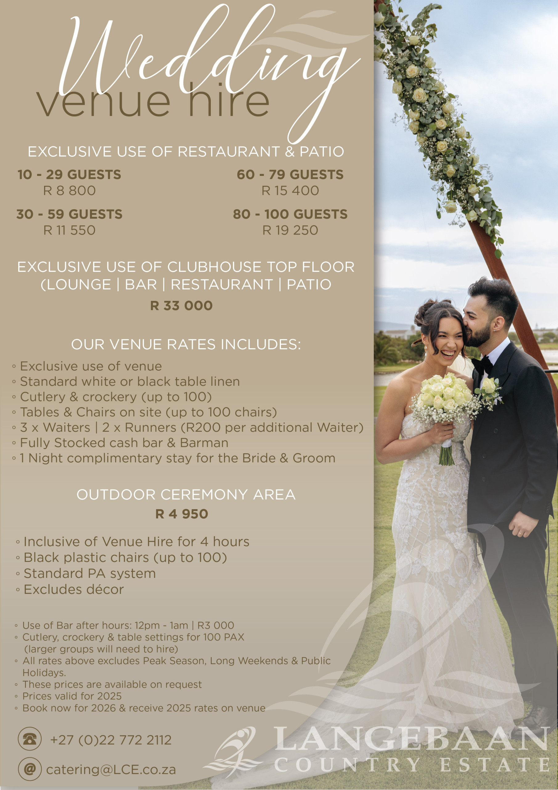 For only R400 per hour, you can hire this Venue for that special event. You can bring your own catering, cake & décor or you can relax and leave the catering up to us.